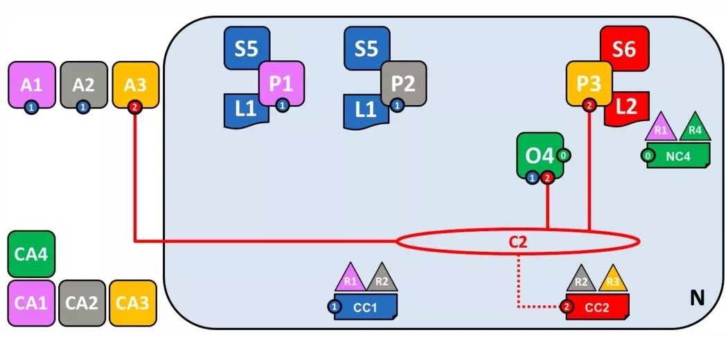 接下来,智能合约 S5 可以被安装到 P1 上,P1 可以看到 S5 的代码。R1 中的一个 Client Application A1 可以加入 C1,并通过 P1 执行 S5 来访问 L1。这时,由于 A1 是 R1 的成员,它可以选择连接O4 或者 R1,通过它们中的哪个都可以连接上 P1。S5 由 R1 实现,并在 P1 上安装。而且 S5 还要在 C1 上安装,以便别的 Client Application 可以找到它。