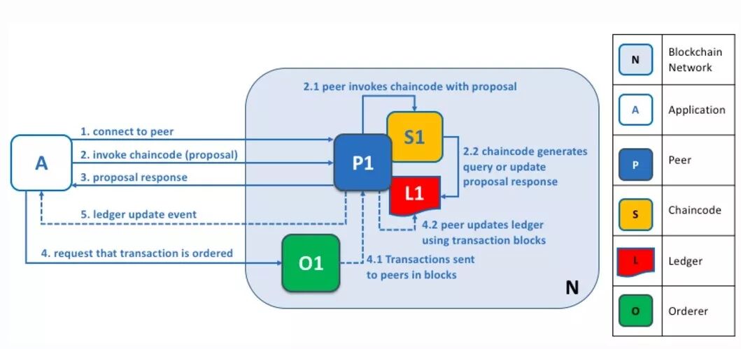 我们知道,更新 Transaction 和查询 Transaction 是不同的,更新涉及到写入操作,需要所有相关节点达成共识后才能执行,一个 peer 是不能更新 Ledger 的。所以,为了实现共识,Fabric 更新涉及到3个阶段。