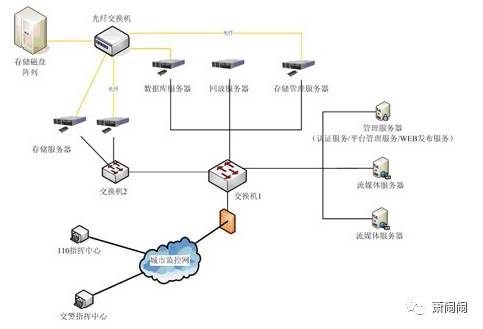 SAN存储通过光纤交换机将磁盘空间分配给不同的服务器,服务器通过以太网对外提供服务,存储区域与用户的应用区域隔离。