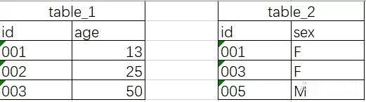 -- table_1中有id,age; table_2中有id,sex。想取出id,age,sex 三列信息-- 将table_1,table_2 根据主键id连接起来select a.id,a.age,b.sex from(select id,age from table_1) a--将select之后的内容存为临时表ajoin(select id, sex from table_2) b--将select之后的内容存为临时表bon a.id =b.id