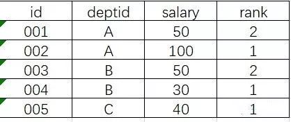 -- 按照字段salary倒序编号select *, row_number() over (order by salary desc) as row_num from table_1;-- 按照字段deptid分组后再按照salary倒序编号select *, row_number() over (partition by deptid order by salary desc) as rank from table_1;