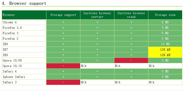 jStorage是一个跨浏览器的将key-value类型的数据存储到浏览器本地存储的JS插件——jStorage支持所有主流浏览器,PC机(甚至包括是IE6)和移动终端均可用。此外,jStorage的实现不依赖任何其它js库(库无关),它和其他js库(Query, Prototype, MooTools等)有良好的兼容性。但是为了让它能够支持老版本的IE(比如蛋疼的IE6),需要依赖第三方库(Prototype, MooTools)或JSON2。