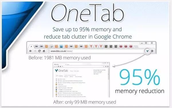 一下子打开 N 多标签的习惯,除了影响效率更会对电脑内存造成巨大负担。因为 Chrome 的标签是独立进程,所以当打开过时浏览器内存占用就会超过 2G 甚至更多,自然会卡,这款插件正好可以解决 Chrome 内存占用过多的问题。单击 OneTab 图标,将所有标签页转换成一个列表。当您需要再次访问这些标签页时,可以单独或全部恢复它们。有时间标签,也可以分组。