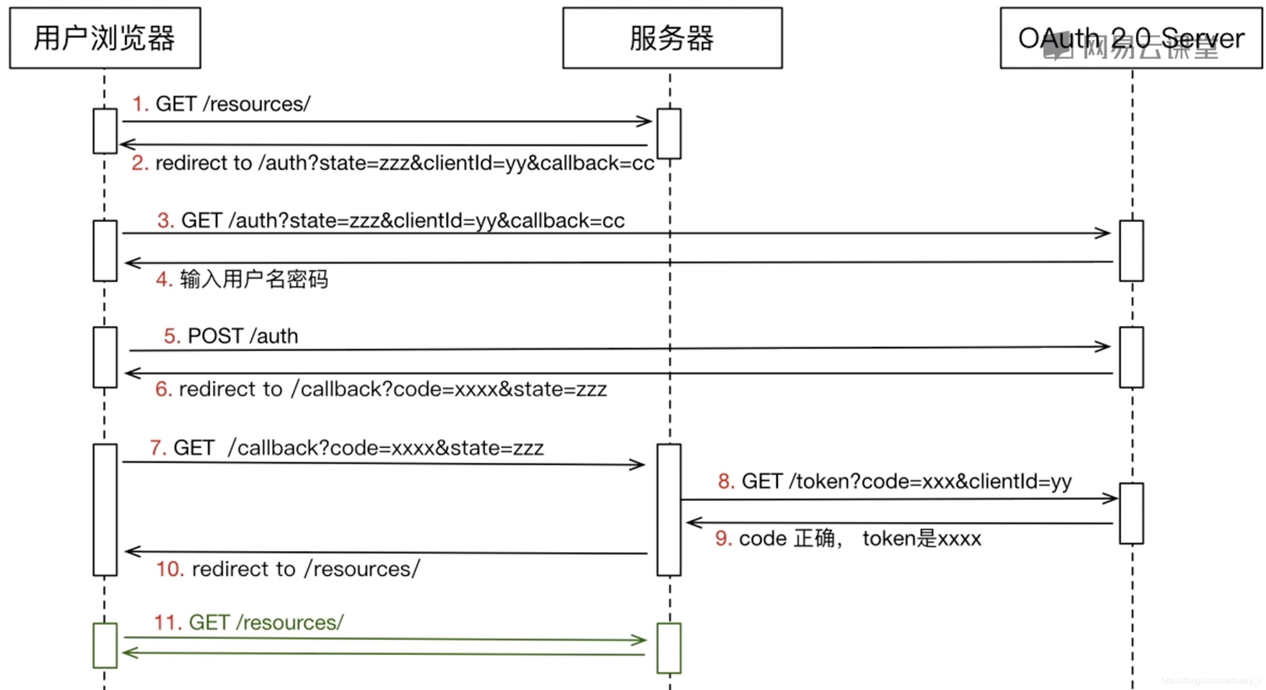 如果我们用了授权码模式,OAuth Server会返回一个授权码给用户浏览器,并且让用户重定向到OAuth Client (上图中间的服务器), 这时, OAuth Client收到授权码,了解用户需要认证操作,就把授权码+Client id/Client secret一起发给OAuth Server获取access token (步骤7,8,9)。
