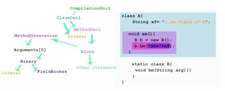 上图即为语法树,左边树的节点对应右边相同颜色覆盖的代码块。