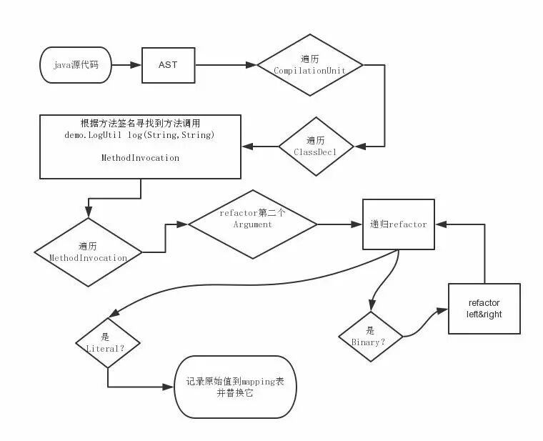 先把所有源码解析为AST语法树,遍历每一个编译单元与单元的类声明,在类声明里根据日志方法的签名找到所有的方法调用,然后遍历每个方法调用,将方法调用的第二个参数表达式放入递归方法,对字符串字面值进行改写。