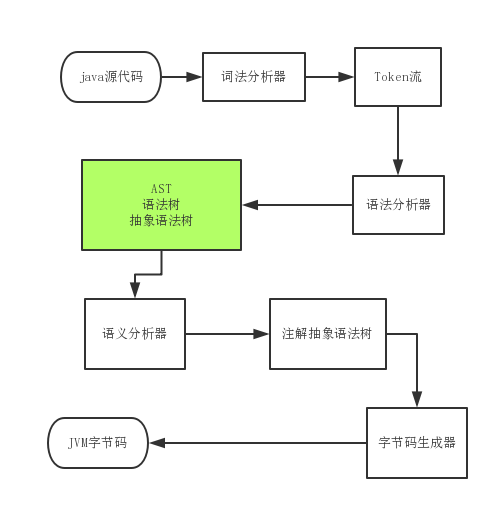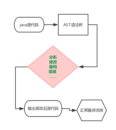 众所周知,Java 编译流程(上图)中也有对AST语法树的提取处理,那是否可以在此环节操作语法树呢?由于编译链代码栈太深,鲜有对外的接口和文档,使得其可操作性不强。不过,如果采用迂回战术如下图所示,可以对其进行操作。