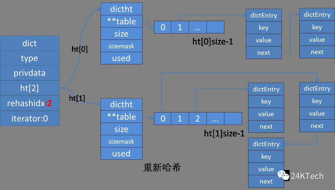 两个哈希表(ht[2])。只有在重哈希的过程中,ht[0]和ht[1]才都有效。而在平常情况下,只有ht[0]有效,ht[1]里面没有任何数据。
