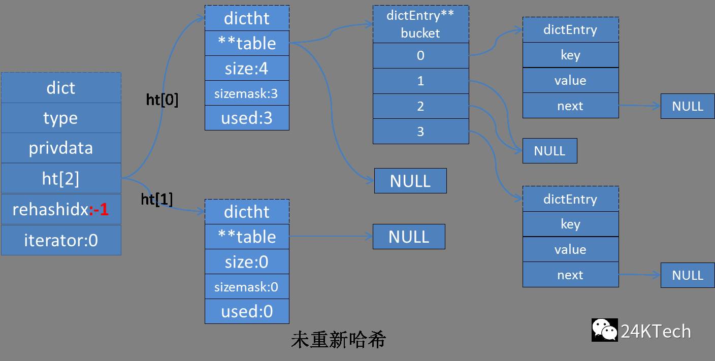 当前重哈希索引(rehashidx)。如果rehashidx = -1,表示当前没有在重哈希过程中;否则,表示当前正在进行重哈希,且它的值记录了当前重哈希进行到哪一步了。