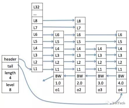 skiplist为了实现跳跃表的快速修改和查询操作,其内部还在每个节点上都保存了一个用于指向其后节点的指针数组,以及一个指向前一个节点的指针;并且为了快速获取跳跃表的节点数目和指针数组的最大长度,其分别创建了一个length和一个level属性用于快速查询。