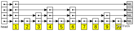 跳跃表的遍历总是从高层开始,然后随着元素值范围的缩小,慢慢降低到低层。