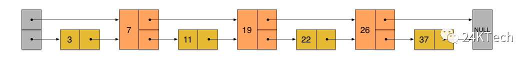 利用同样的方式,我们可以在上层新产生的链表上,继续为每相邻的两个节点增加一个指针,从而产生第三层链表。如下图: