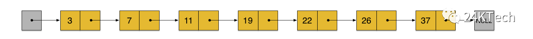 我们先来看一个有序链表,如下图(最左侧的灰色节点表示一个空的头结点):
