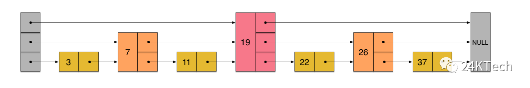 在这个新的三层链表结构上,如果我们还是查找23,那么沿着最上层链表首先要比较的是19,发现23比19大,接下来我们就知道只需要到19的后面去继续查找,从而一下子跳过了19前面的所有节点。可以想象,当链表足够长的时候,这种多层链表的查找方式能让我们跳过很多下层节点,大大加快查找的速度。