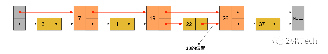 这样所有新增加的指针连成了一个新的链表,但它包含的节点个数只有原来的一半(上图中是7, 19, 26)。现在当我们想查找数据的时候,可以先沿着这个新链表进行查找。当碰到比待查数据大的节点时,再回到原来的链表中进行查找。比如,我们想查找23,查找的路径是沿着下图中标红的指针所指向的方向进行的: