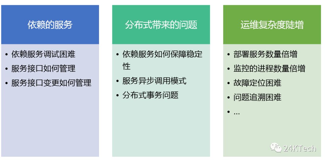 运维复杂度陡增,如:部署物数量多、监控进程多导致整体运维复杂度提升。