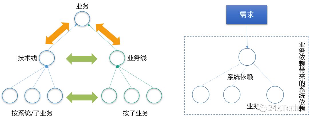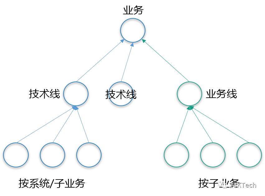 业务线的划分常常按业务细分,技术团队要负责支持全部业务线,因此技术团队的划分通常按系统或者是业务,Two pizza团队的原则在组织层级的任何部分都适用,当人数过多时,必须继续拆分。