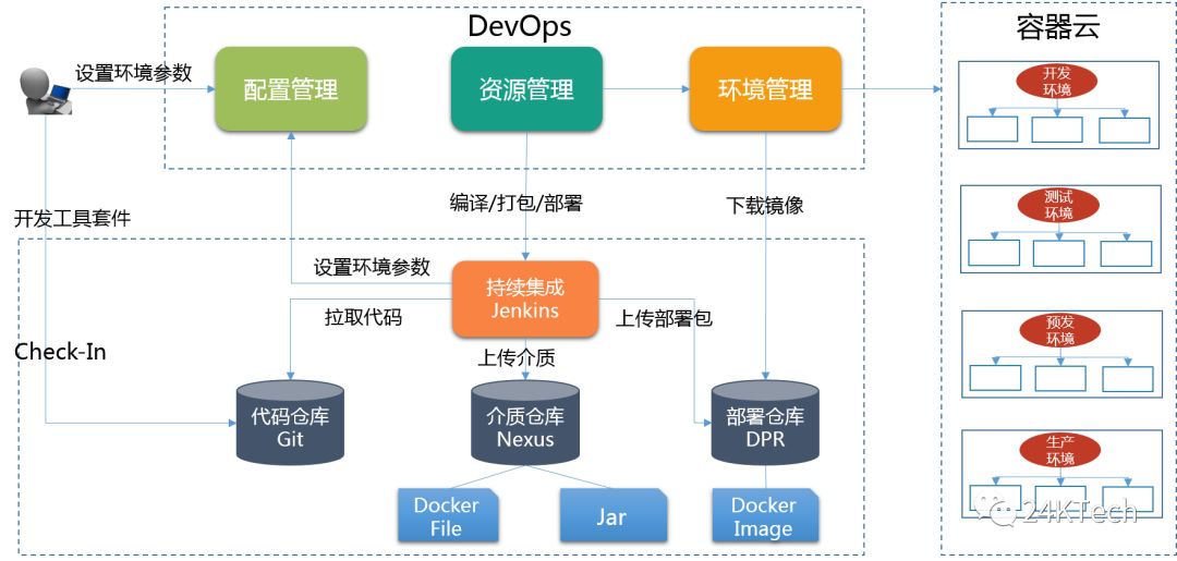 在运维方面,首先我们要解决的就是持续集成和持续交付,能够方便的用持续集成环境把程序编译成介质包和部署包并持续稳定的部署到每个环境。