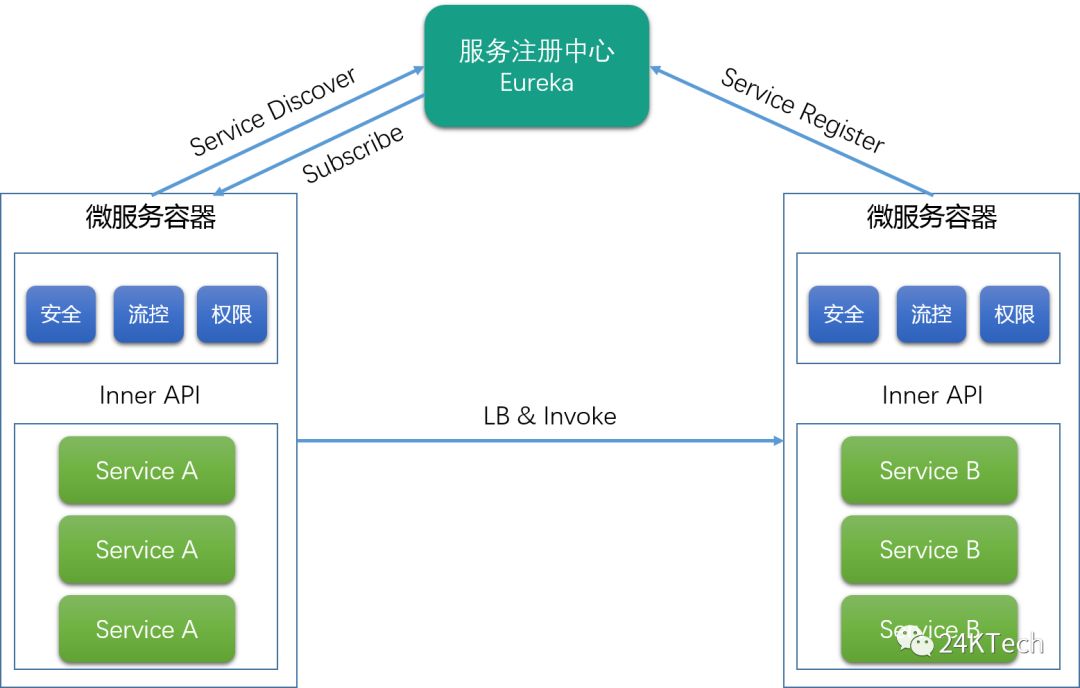 我们的服务注册发现能力是依赖SpringCloud Eureka组件实现的。服务在启动的时候,会将自己要发布的服务注册到服务注册中心;运行时,如果需要调用其他微服务的接口,那么就要先到注册中心获取服务提供者的地址,拿到地址后,通过微服务容器内部的简单负载均衡期进行路由用。