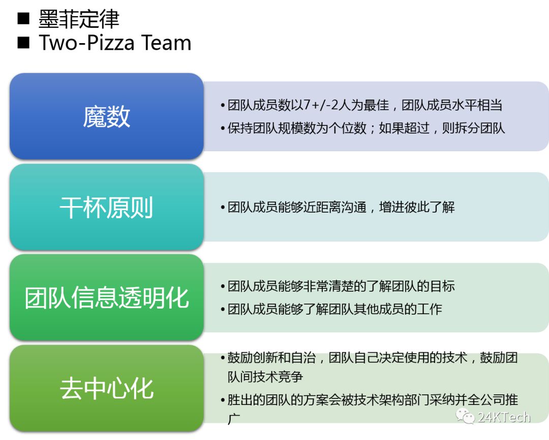 根据“康威定律”,软件架构是由组织的架构决定的,因此按照贝索斯“two-pizza”团队的理论和敏捷方法,构建小的团队,可以有效减少沟通成本,有利于团队的自治。