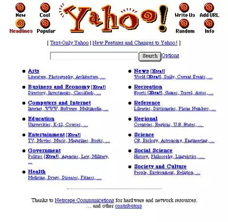 是的, 我就是鼎鼎大名的Javascript, 典型的高富帅,前端编程之王,数以百万计的程序员使用我来编程。 如果你没有用过我就太out了。 不过当我是一个屌丝时, 真的没有想到能发展到如今的地位......第一章:出世我出生在上古时代的浏览器Netscape中, 那个时候的网页真是乏善可陈, 你可能都想象不到, 主要是些丑陋的静态文本和简单的图片, 和现在美轮美奂的页面相比,差的实在太远了, 不信你请看著名的Yahoo 网站:那个时候人们还在用Modem(调制解调器)通过电话线拨号上网, 每次拨号都有种吱吱啦啦声音, 就像一个铁片努力的刮一个锅底,让无数人抓狂不已。