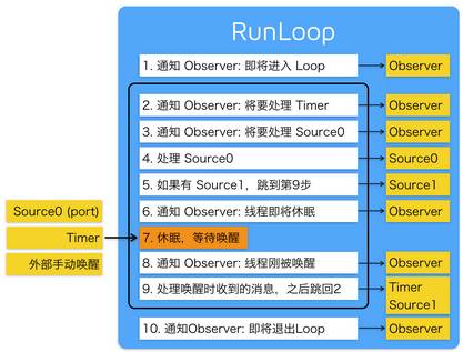 Source0 只包含了一个回调(函数指针),它并不能主动触发事件。使用时,你需要先调用 CFRunLoopSourceSignal(source),将这个 Source 标记为待处理,然后手动调用 CFRunLoopWakeUp(runloop) 来唤醒 RunLoop,让其处理这个事件。