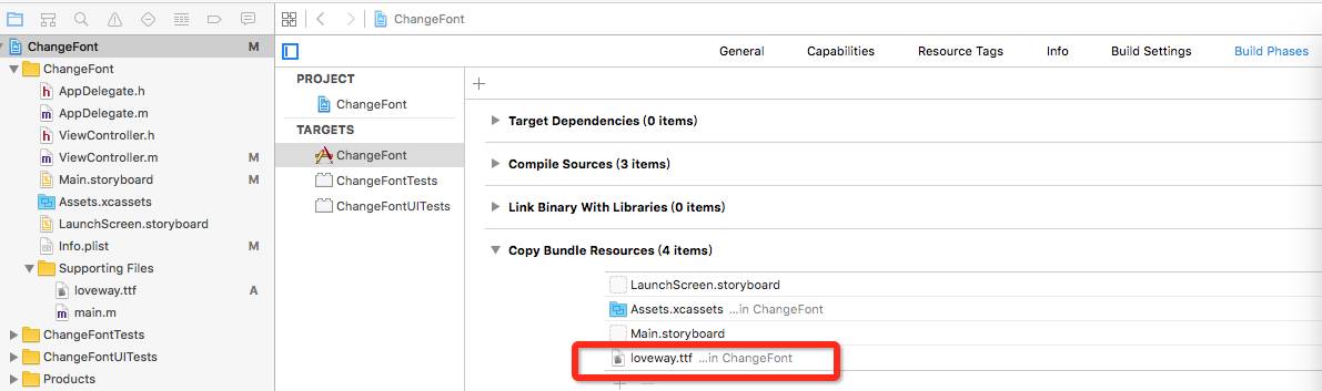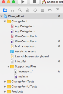 我们新建一个项目名叫ChangeFont,然后我就随便找了个名叫loveway.ttf的字体库拖进去,里面的工程目录大概就是这样的