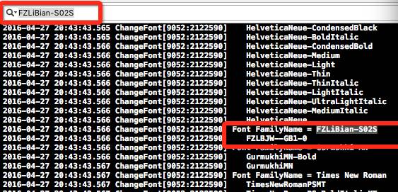 这样我们就可以看到了这个字体的族科名字,我们看到的是FZLiBian-S02S,于是我们在刚才输出全部字体名的控制台搜索一下这个族科名,就可以知道具体的字体名了