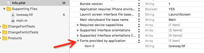 我们之前已经把loveway.ttf这个文件拖进去了,现在在plist文件里面配置一下。打开plist然后加入名为Fonts provided by application的一行,在item里把我们的字体名字加进去