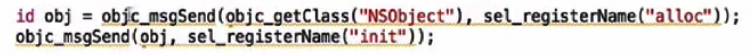 删除掉一些强制转换语句,可以看到调用方法本质就是发消息,[[NSObject alloc]init]语句发了两次消息,第一次发了alloc 消息,第二次发送init 消息。利用这个功能我们可以探究底层,比如block的实现原理。