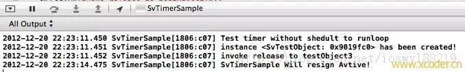 观察运行结果,我们发现这个timer知道执行退出也没有触发我们指定的方法,如果我们把上面测试程序中“//[[NSRunLoop currentRunLoop] runUntilDate:[NSDate dateWithTimeIntervalSinceNow:3]];”这一行的注释去掉,则timer将会正确的掉用我们指定的方法。