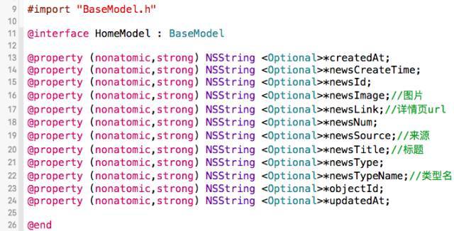 1、首先是model层的代码,基于JSONModel封装了BaseModel类(基类: 以后的Model都可继承此类),继承自BaseModel,实现HomeModel类。