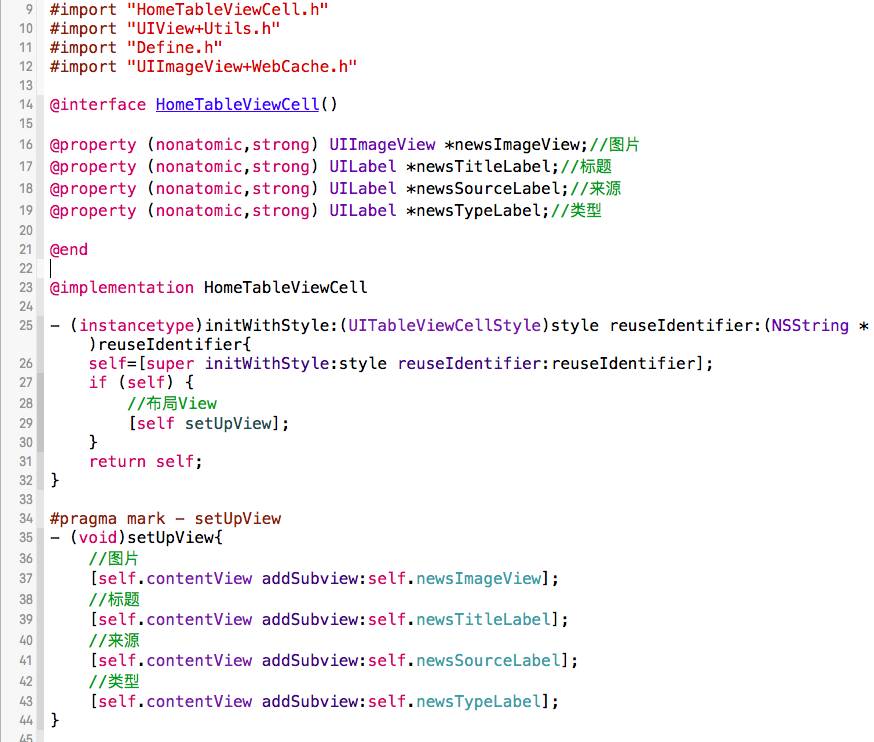 2、然后是View层的代码,View层控件全部用懒加载方式,尽可能减少内存消耗;不喜欢用XIB,所以习惯纯代码编写。