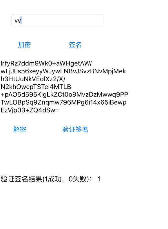 NSString* private_key_string = @"MIICdQIBA......."; NSString* public_key_string = @"MIGfMA0GC......."; NSString *publicKeyFilePath = [[NSBundle mainBundle] pathForResource:@"rsa_public_key.pem" ofType:nil]; NSString *privateKeyFilePath = [[NSBundle mainBundle] pathForResource:@"rsa_private_key.pem" ofType:nil]; HBRSAHandler* handler = [HBRSAHandler new]; //两种方式导入 // [handler importKeyWithType:KeyTypePublic andPath:publicKeyFilePath]; //[handler importKeyWithType:KeyTypePrivate andPath:privateKeyFilePath]; [handler importKeyWithType:KeyTypePrivate andkeyString:private_key_string]; [handler importKeyWithType:KeyTypePublic andkeyString:public_key_string]; NSString* sig = [handler signString:@"签名字符串"]; NSString* sigMd5 = [handler signMD5String:@"签名字符串"]; NSLog(@"%@%@",sig,sigMd5); BOOL isMatch = [handler verifyString:@"签名字符串" withSign:sig]; BOOL isMatchMd5 = [handler verifyMD5String:@"签名字符串 NSLog(@"%d%d",isMatch,isMatchMd5); NSString* enString = [handler encryptWithPublicKey:@"加密字符串"]; NSString* deString = [handler decryptWithPrivatecKey:enString]; NSLog(@"%@",deString);