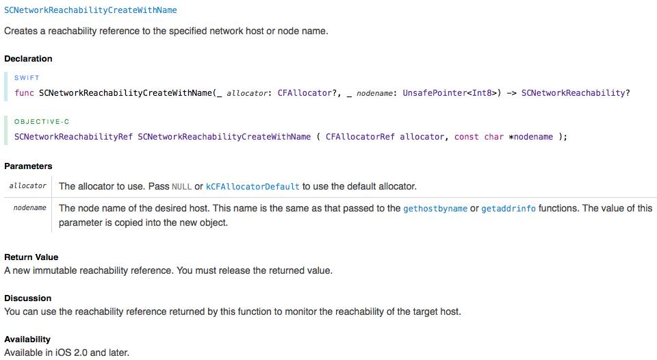 这个方法在著名的Reachability中是用到的,我们常用的网络库AFNetworking就用了这个。所以用到的同学得好好查一下了,另外这个项目的作者几天前刚刚就这个问题有一个新的提交,不过最新的release版本中还没有加进去,可以点下面链接先去看看他都改了哪些地方。