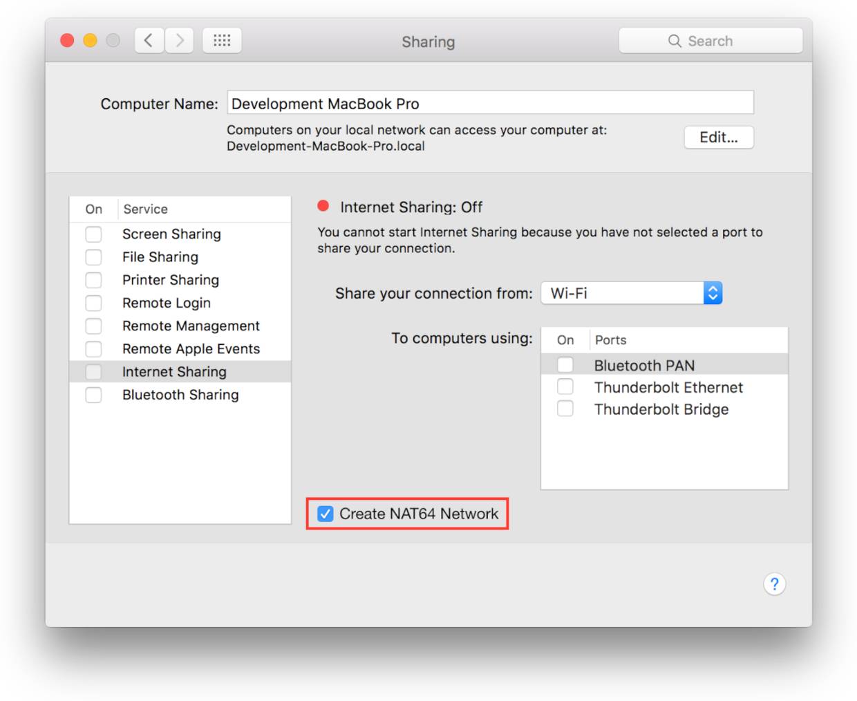 之后在“Sharing”界面中,我们会看到和之前不一样的地方,就是红框所标的地方,多了一个叫“Create NAT64 Network”的选框,选中它。