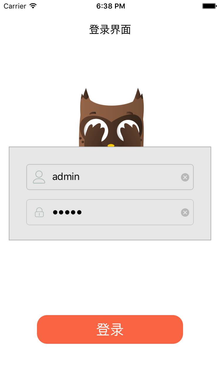 这个界面用了别人的素材,超萌的一个登录框。登录界面的数据是在Class-我-Controller-UserAccount.plist文件中。如果还不清楚先使用账号:admin ;密码:admin