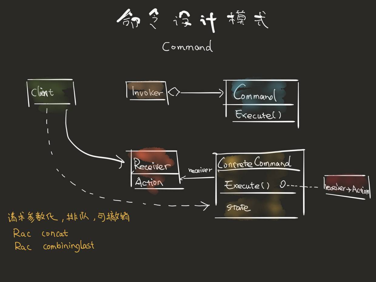 了解了这种编程模型,再去了解下ReactiveCocoa使用的三种设计模式就能够更容易的将它学以致用了,下面配上这三种贯穿ReactiveCocoa的设计模式,看这些图里的方法名是不是很眼熟。