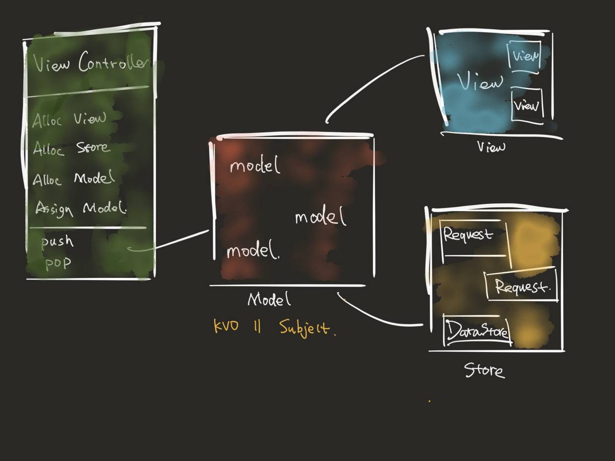 上面的例子也能够看出FRP的另一个响应式编程的特性。说响应式编程之前可以先看看我之前关于解耦的那篇文章里的Demohttps://github.com/ming1016/DecoupleDemo,里面使用了Model作为连接视图,请求存储和控制器之间的纽带,通过KVO使它们能够通过Model的属性来相互监听来避免它们之间的相互依赖达到解耦的效果。