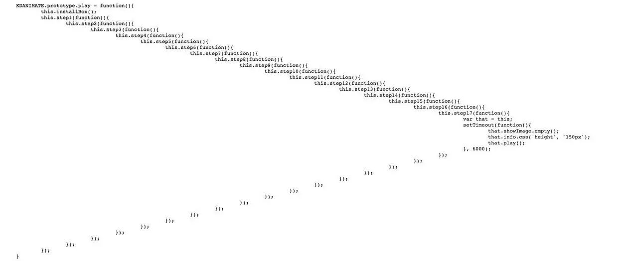 在异步编程中,有一个最最典型的例子就是回调地狱CallBack hell,要是处理的不优雅,就会出现下图这样: