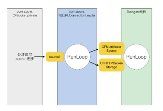 在使用NSURLConnection时,我们会传入一个Delegate,当我们调用了[connection start]之后,这个Delegate会不停的收到事件的回调。实际上,start这个函数的内部会获取CurrentRunloop,然后在其中的DefaultMode中添加4个source。如下图所示,CFMultiplexerSource是负责各种Delegate回调的,CFHTTPCookieStorage是处理各种Cookie的。如下图所示: