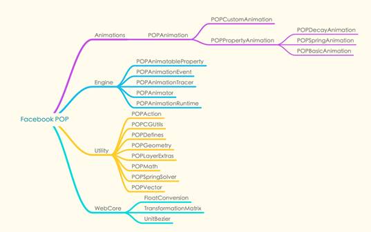 1.2 POP 目前由四部分组成:1. Animations;2. Engine;3. Utility;4. WebCore。下图有助于你更好的理解它的架构