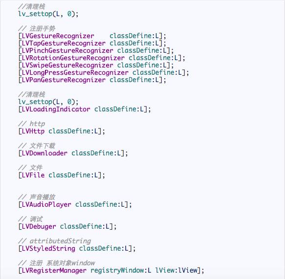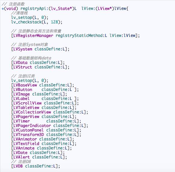 这行代码,我就把它理解为扩展,对Lua API的一个扩展。上面我们提到过,使用Lua构建动态化方案的核心就在于将Android,iOS原生的UI、网络、存储、硬件控制等能力桥接到Lua层。他主要就是为了完成这里,在这里注册大量的API
