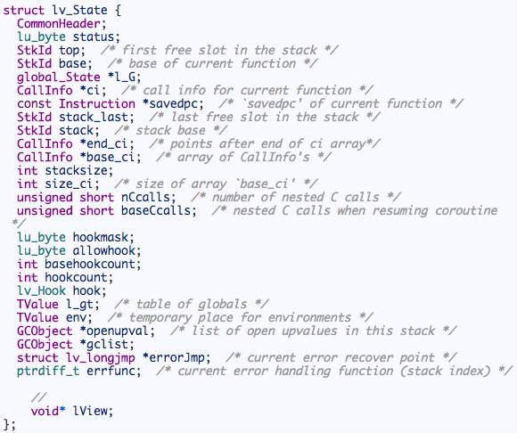 首先就是创建我们的Lua脚本运行环境,并且以上语句的具体作用上面都有过讲解,self.lvState->lView这里主要是因为我们所需的运行东西都在lv_State结构体中,我们就在这个结构体中添加了一指针,来指向我们的当前LDSView。这样就在状态机中存在着lView了。