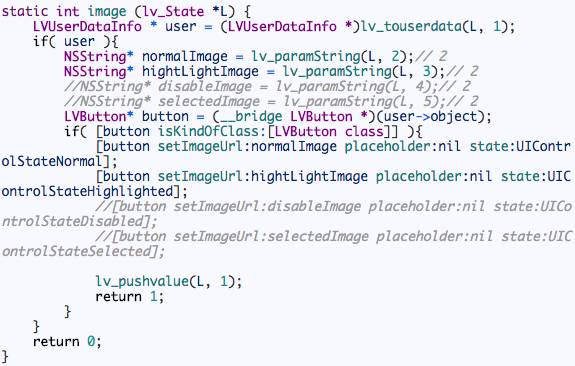 lvNewButton是一个函数,我们上面说过,我们跟Lua环境的交互主要是通过一个虚拟的栈,lv_pushcfunction(L, lvNewButton)的作用就是将lvNewButton函数压入栈顶,然后使用lv_setglobal(L, “Button”)将栈顶的lvNewButton函数传入Lua环境中作为全局函数。这样就是扩展我们的Lua环境,现在我们就可以编写Lua脚本,通过Button()关键字来调用lvNewButton函数。