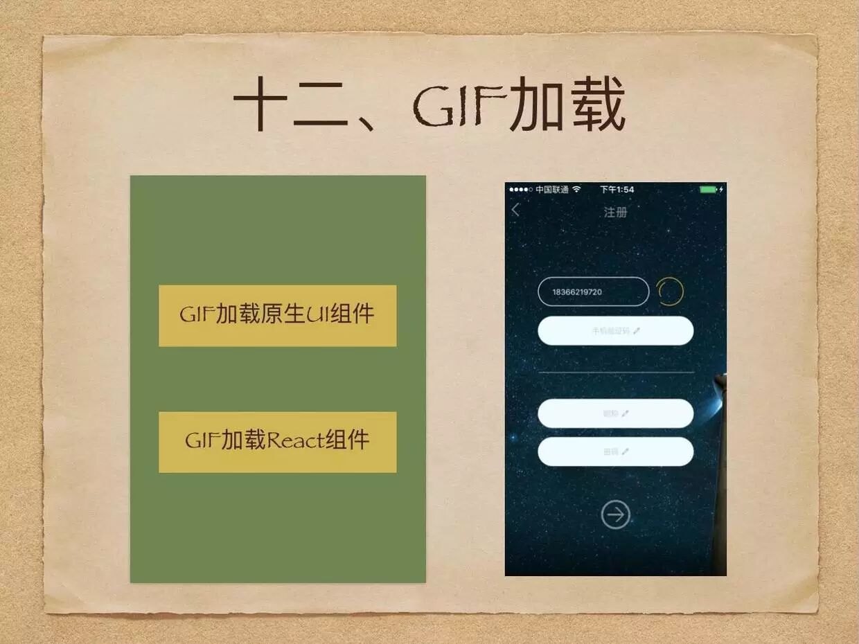 我们在iOS平台上做了一个GIF加载原生UI组件。然后在JS端做成React组件。这样就可以非常方便地和RN的标准组件嵌套使用。