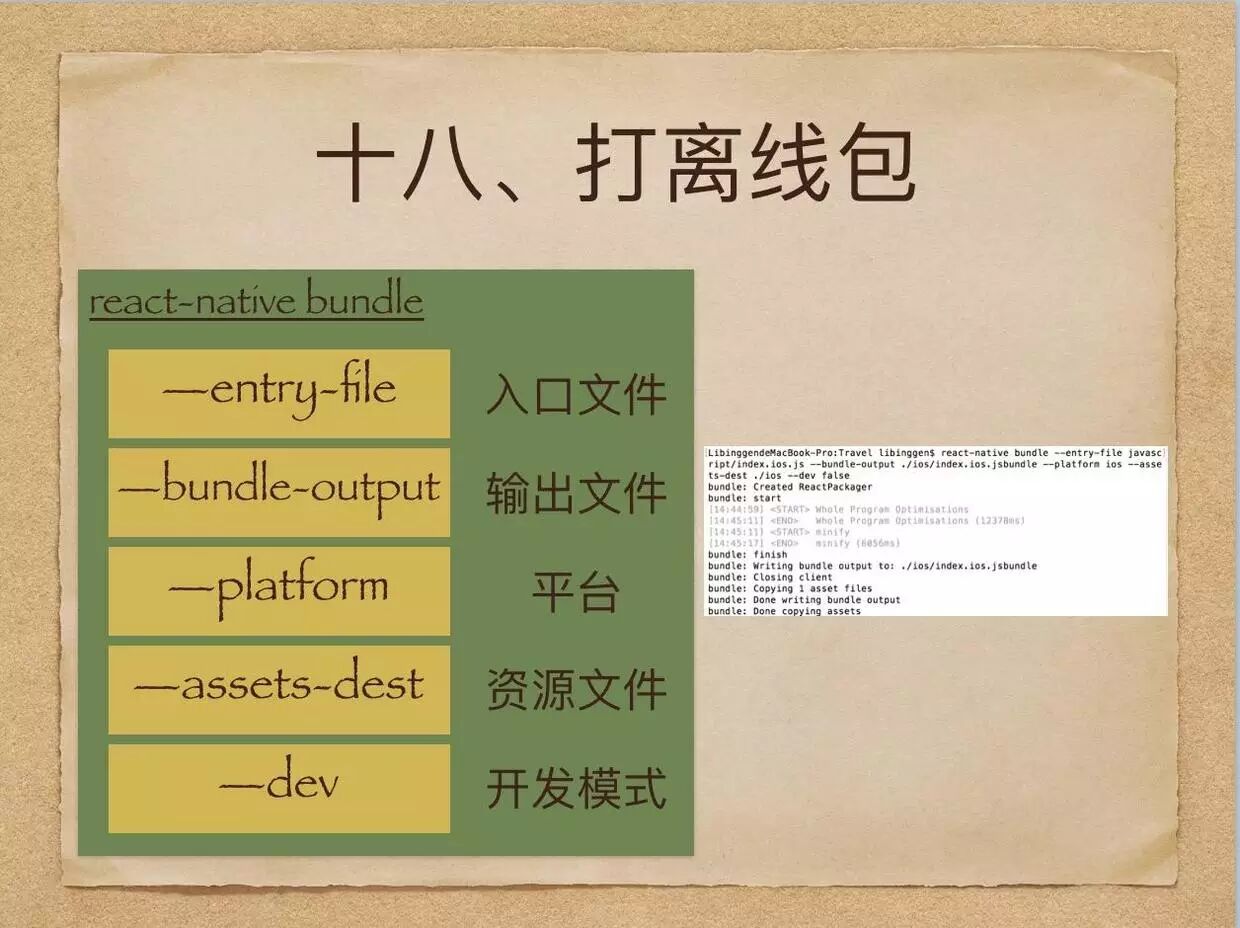 打离线包,只需要一个命令: react-natvie bundle。通过命令参数,指定入口文件、输出文件、平台、资源文件、是否开启开发模式。