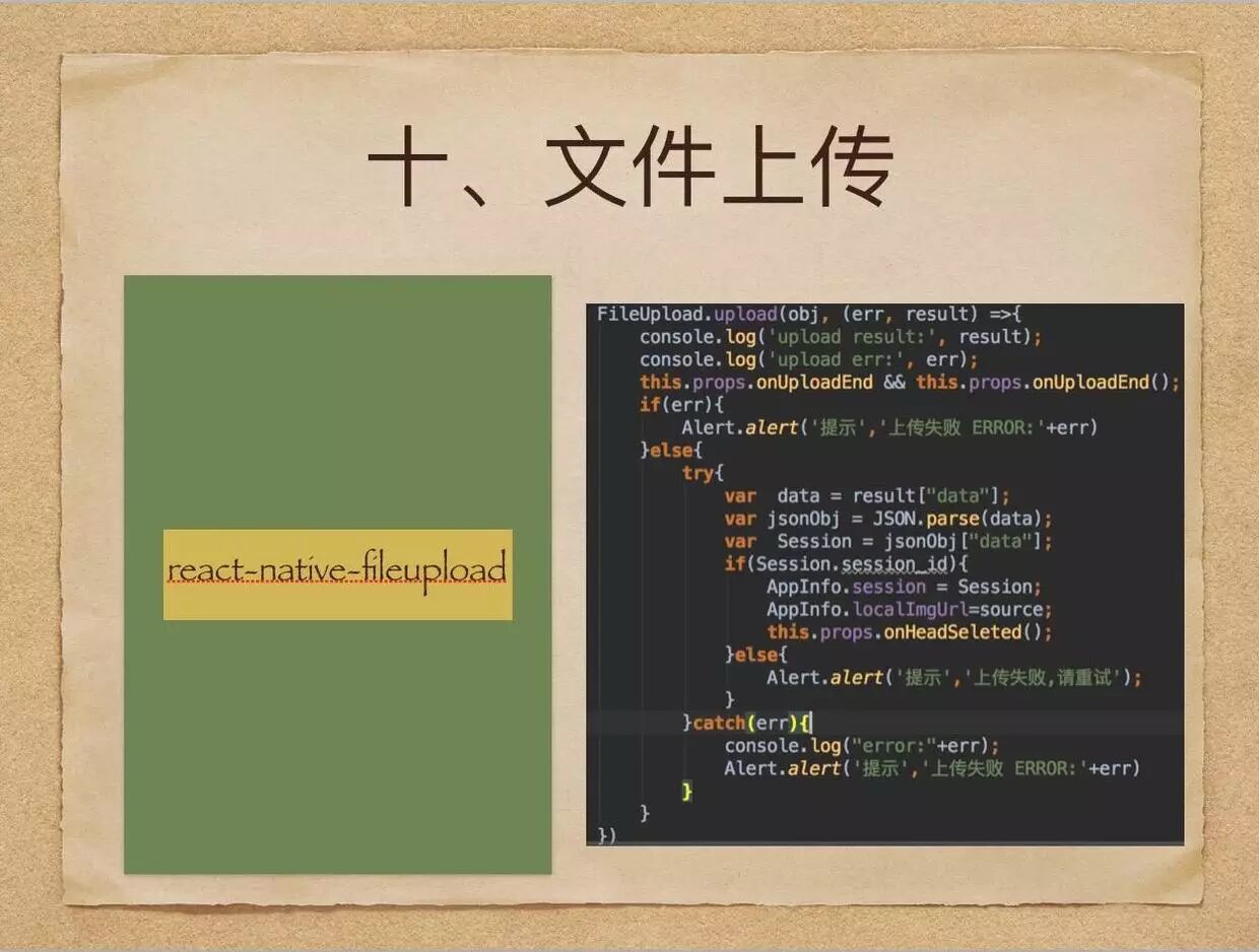 选完图片,我们还要上传到服务器。我们接了一个文件上传RN组件。大家可以浏览一下右边代码,使用非常简单。