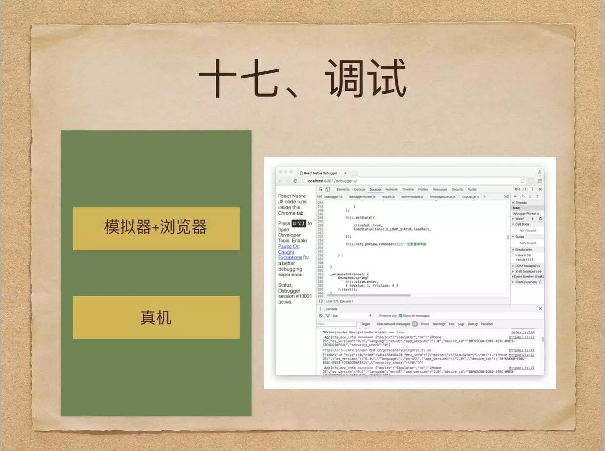 在开发的过程中,必然需要对代码进行调试。RN的调试也非常方便,在开发者菜单上开启浏览器调试就可以输出相应的Log信息。