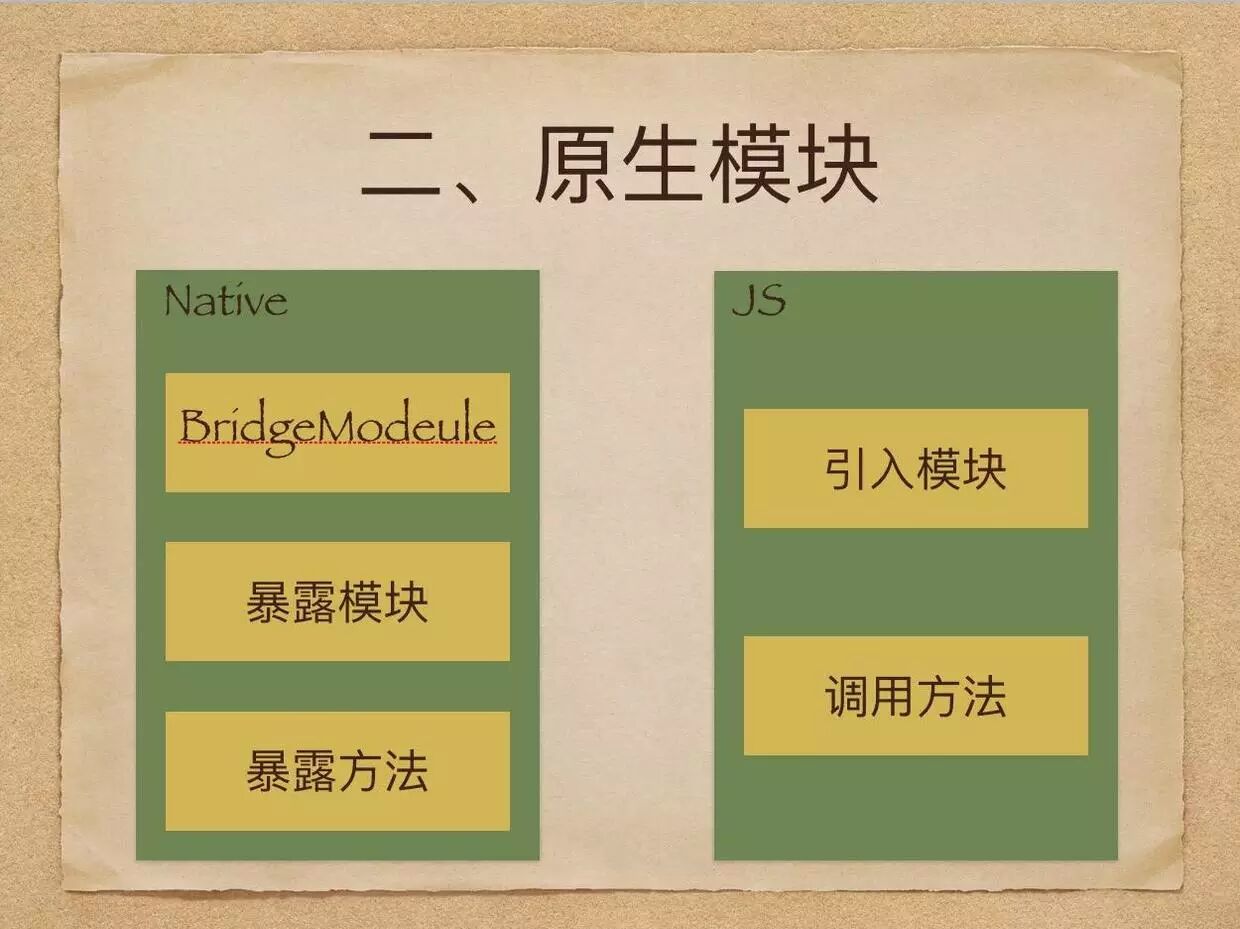 对Native组件的复用,RN有两种形式,一种是不带UI的原生模块。使用过程非常简单。三步就完成Native端原生模块的暴露,两步就完成JS端模块方法的调用。